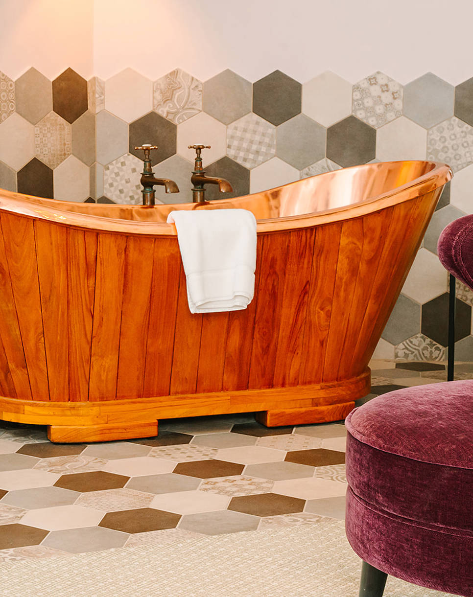 Upstairs you’ll find exposed roof beams and a free-standing copper bath, with a dining area, living area including a sofa bed, desk, luxury bathroom with walk-in shower on the ground floor.