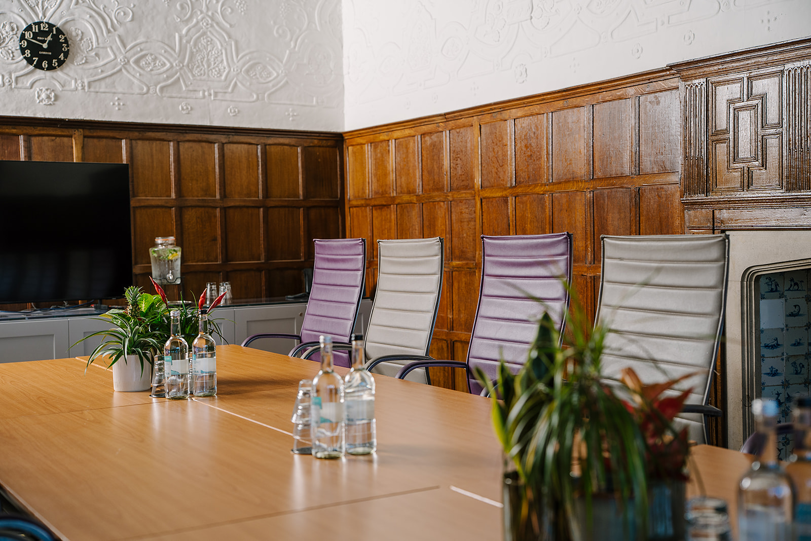 The Bethell meeting room is located on the first floor of the original part of the house, and is decorated with ornate wall styling and dark wood panelling.