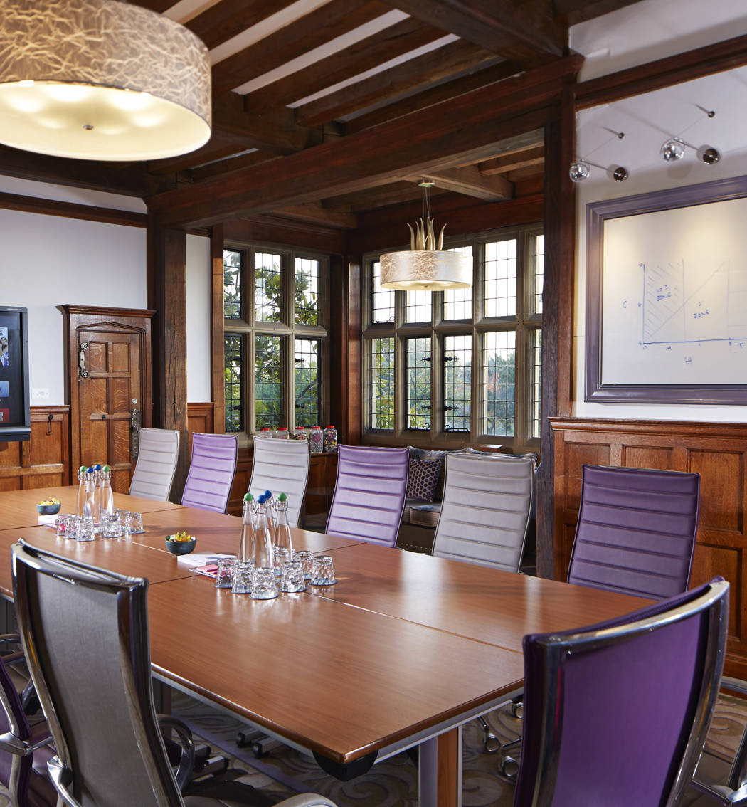 Located in the original part of the building on the first floor, this meeting room features exquisite wood-panelled walls and exposed ceiling beams.