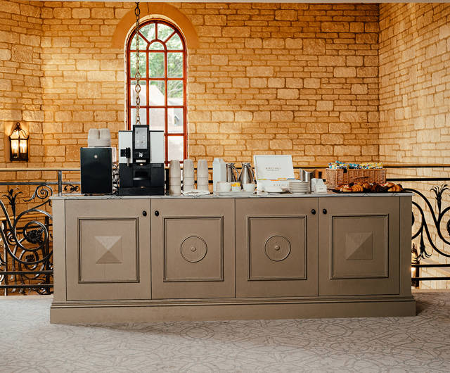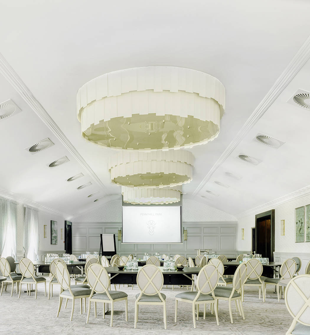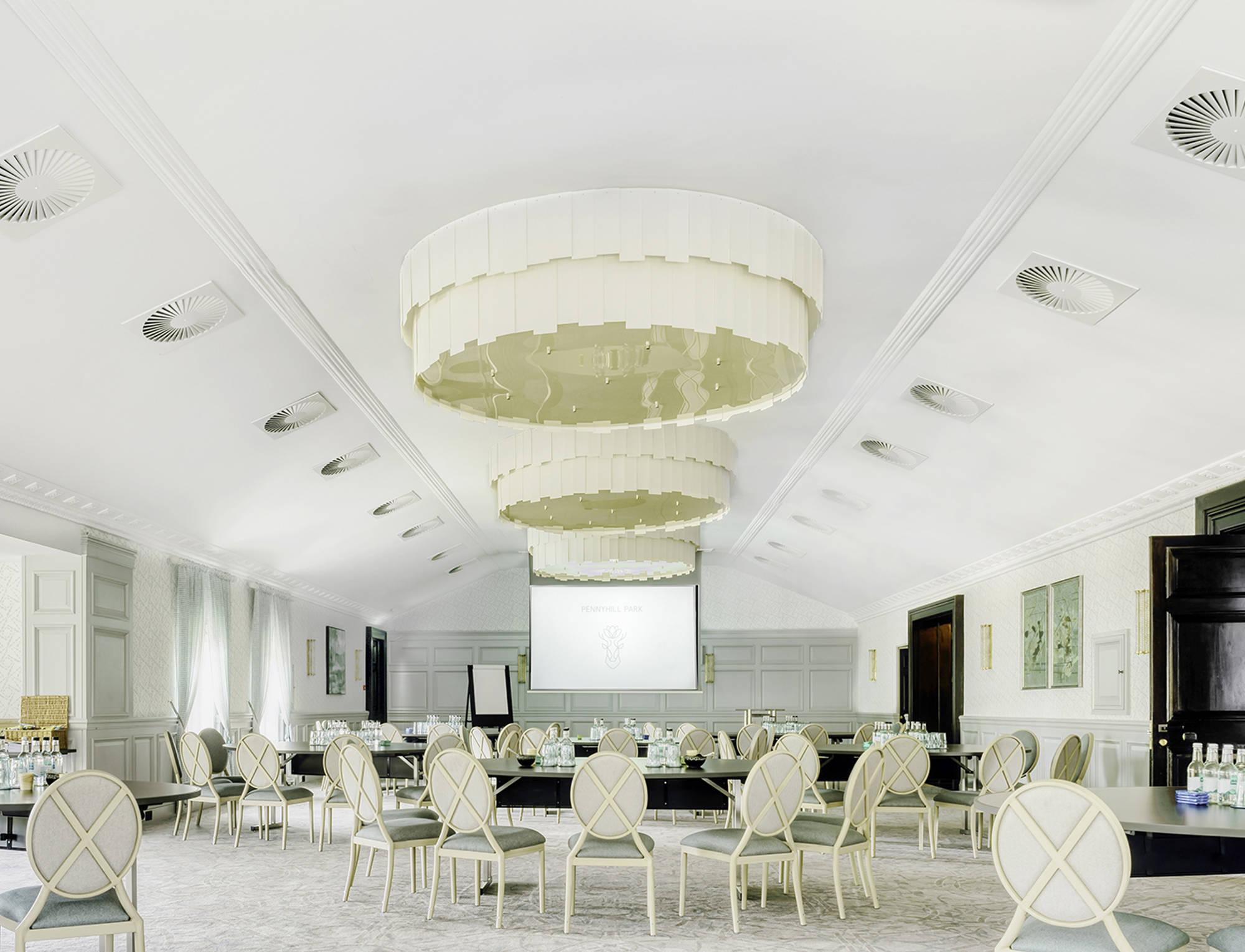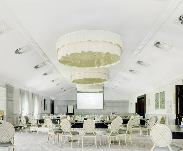 Artwork adorns the wood-panelled walls, and handcrafted chandeliers and spotlights give control to create various atmospheres. In-room technology includes a built-in public address system and air conditioning that can be controlled independently.