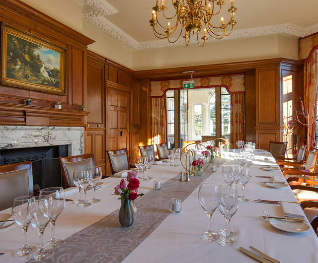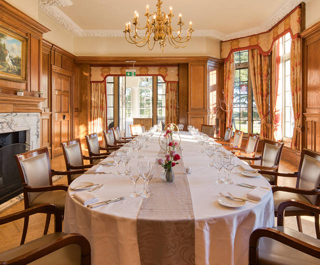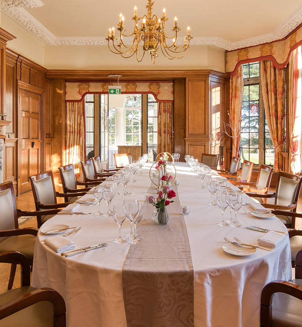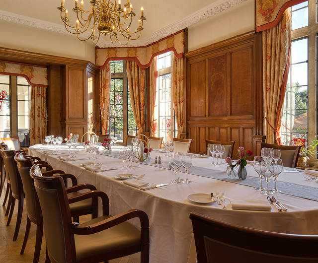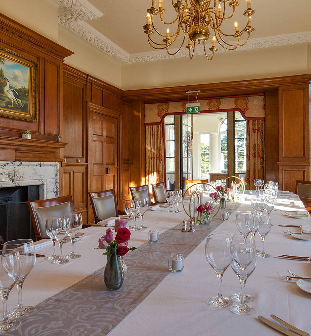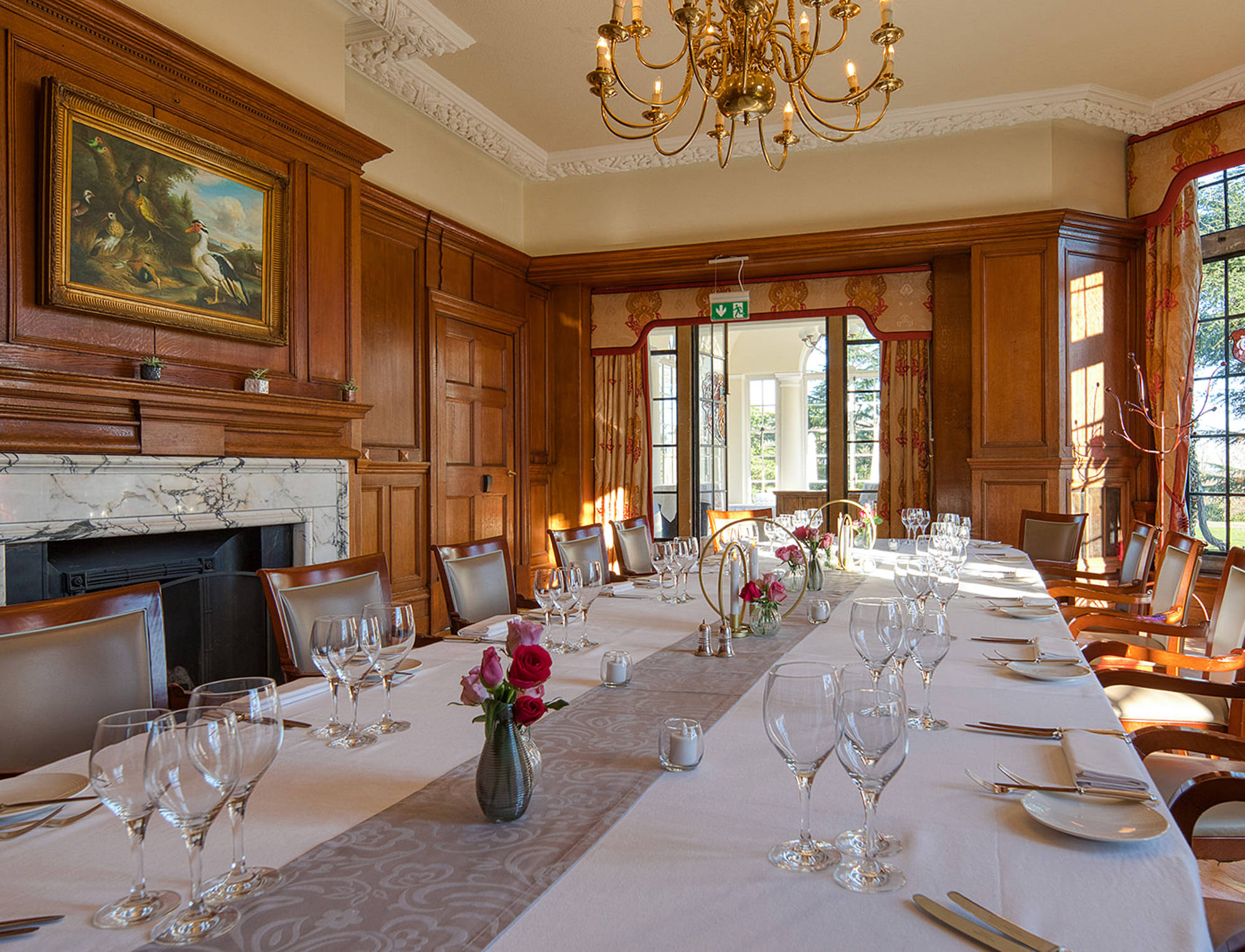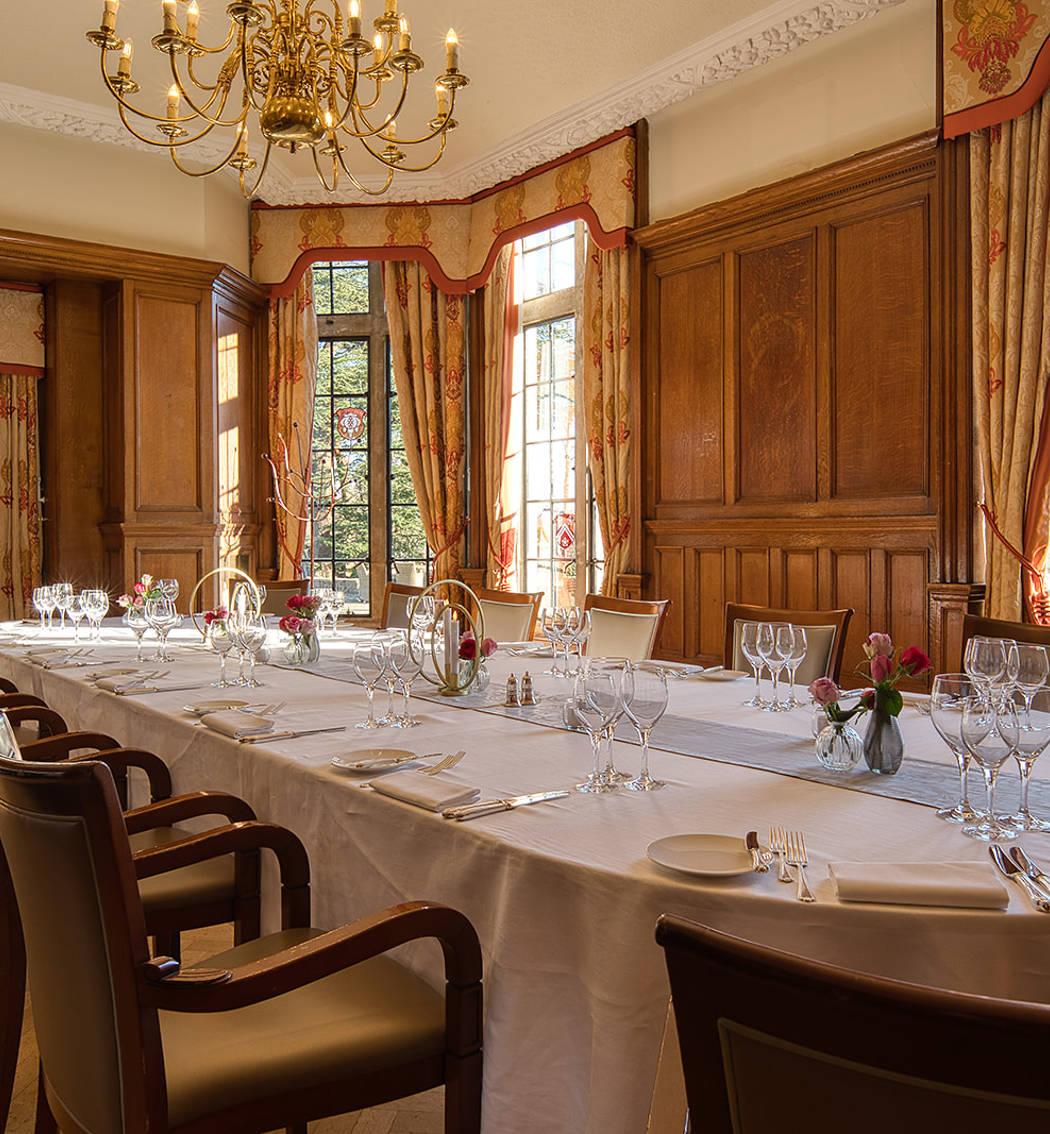 Although primarily used for dining, it also lends itself to all types of meeting thanks to its flexible layout. One wall is a sound-proofed partition which, when opened creates a larger room, together with the Carolean to become The Library.