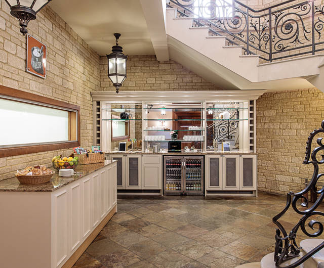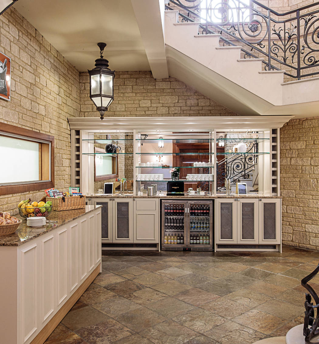 A high ceiling with feature chandeliers contributes to the light, airy feel. A sound-proof wood-panelled partition opens to create a larger space with the Eton room.