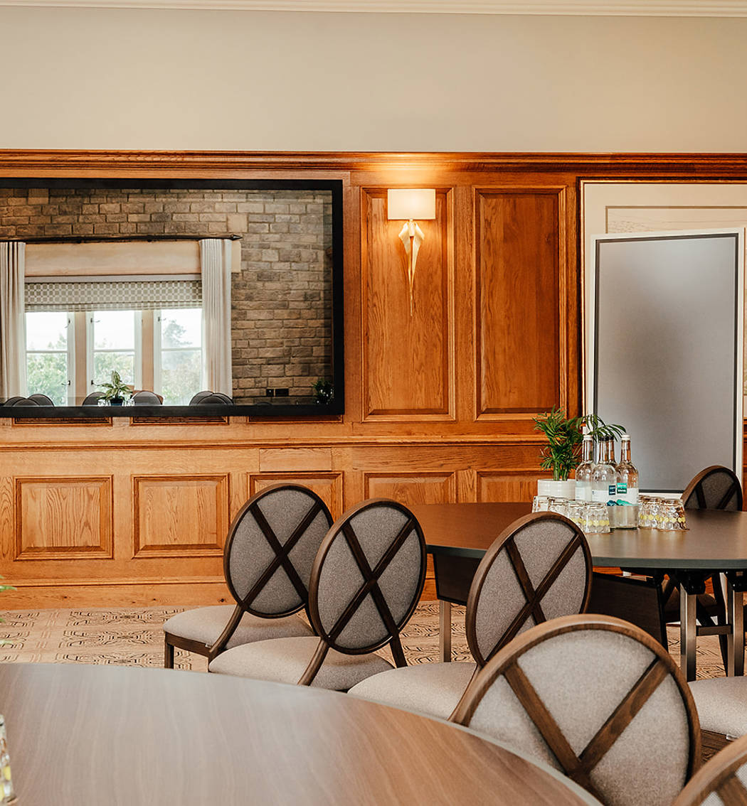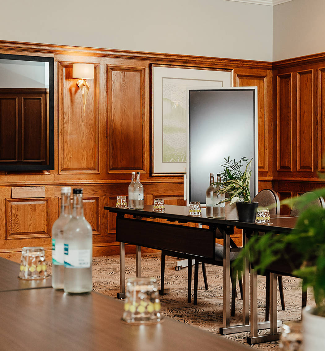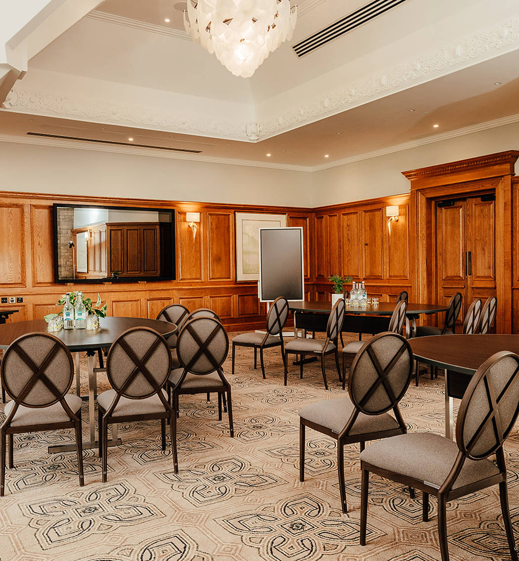 Located on the first floor, Goodwood is a fantastically well-lit meeting space overlooking the South Downs, with generous windows, spotlights and elegant chandeliers. Traditional wood panelling, exposed stonework and intricate cornicing make this one of our most beautiful rooms.