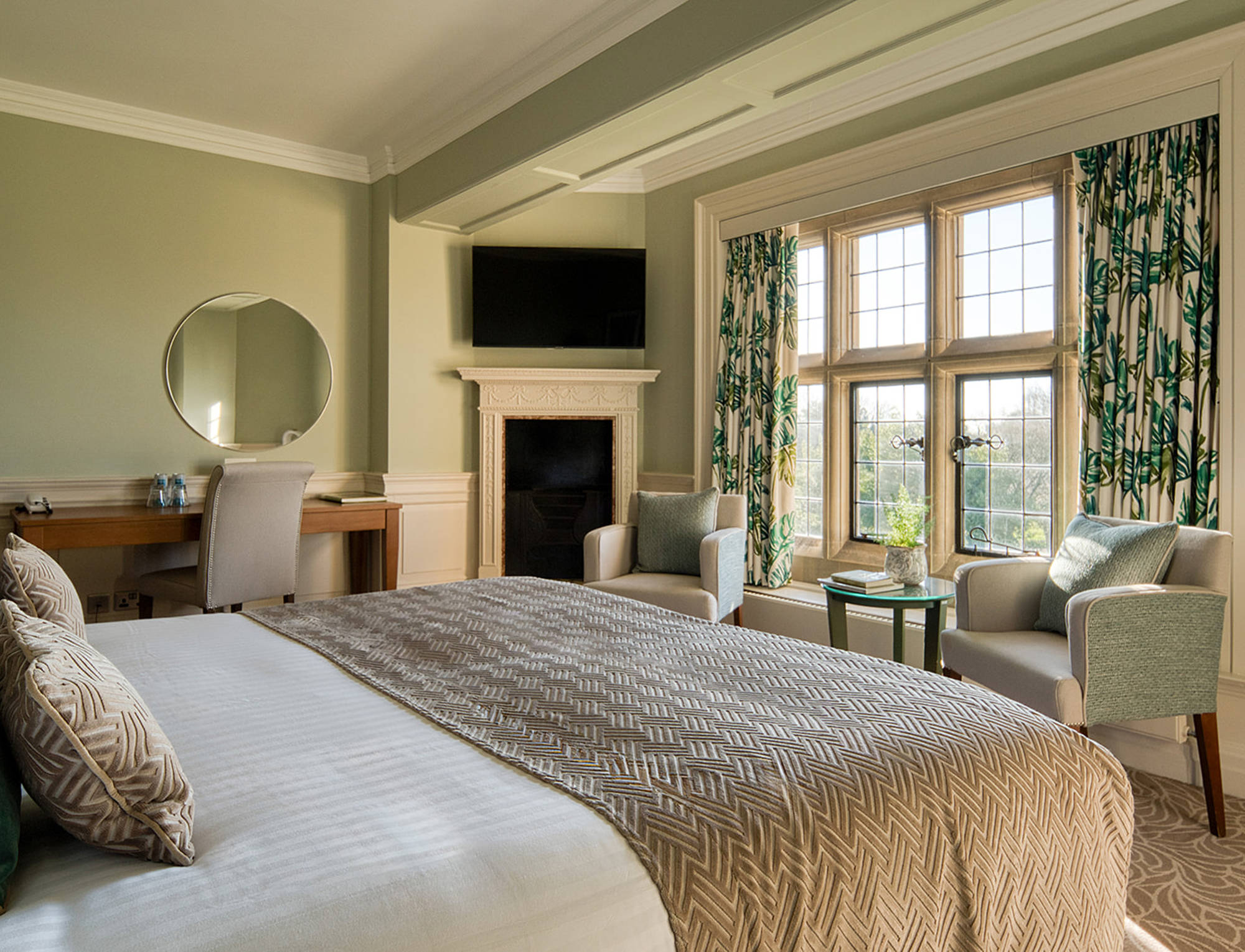 Commanding breathtaking views over the chestnut lawn, this room is brimming with original features, with wide and wonderful windows, a cute corner fireplace and beautiful wood panelling.