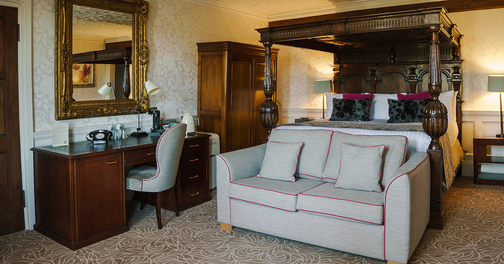 Roomy and romantic, this extra-special signature room offers a magnificent, traditional space with a standout centrepiece: a carved four-poster bed.