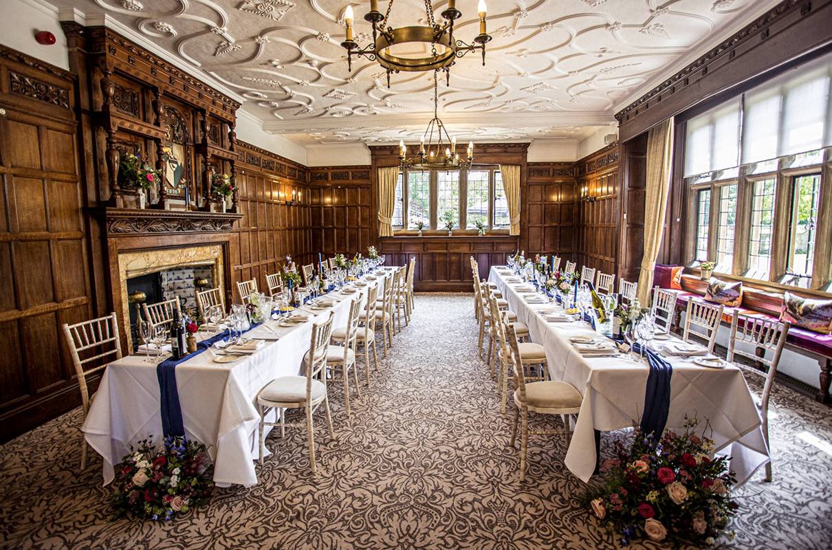 A perfect pairing with a reception in the Great Hall, the Long Gallery also has a wealth of beautiful original features, like the hand-carved oak panelling, ornate ceiling and original chandeliers.