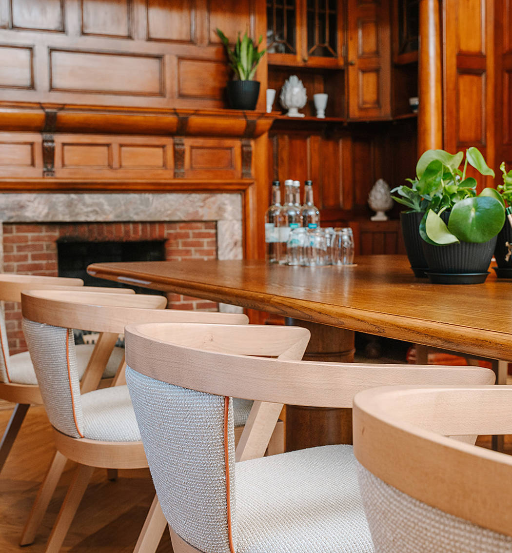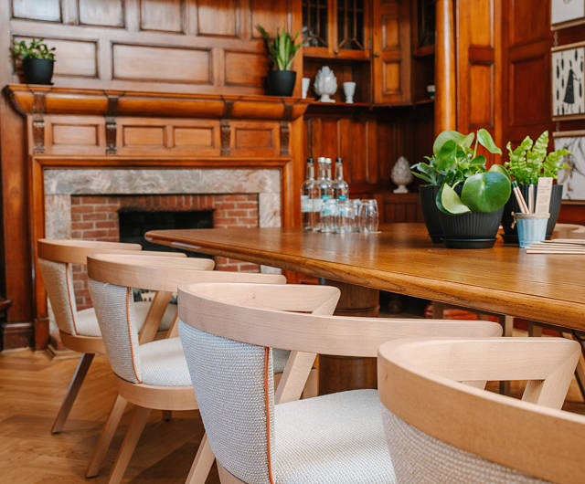 A charming setting with an open fireplace and arched windows, the room can also be configured for business events or board meetings.