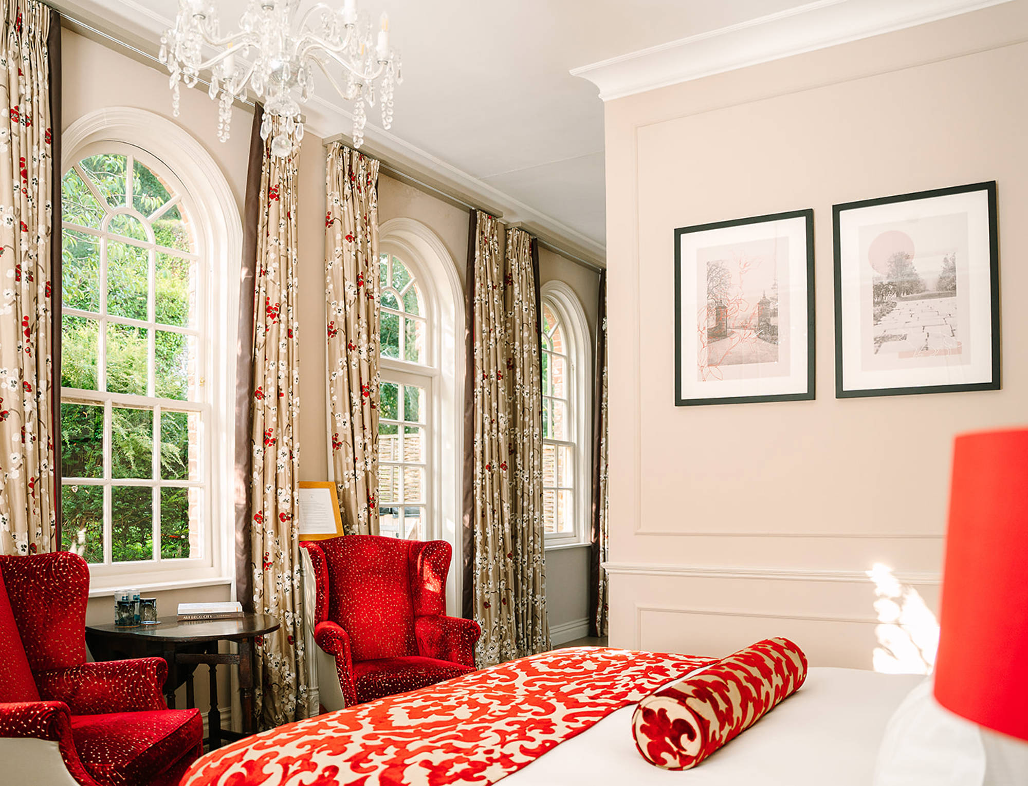 With its very own private hot tub on a terrace overlooking the chapel ruins, this room is a true one of a kind at Lainston House.
