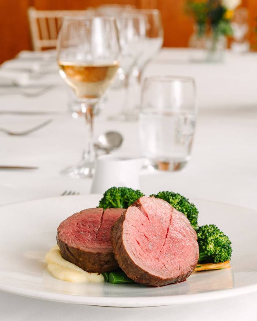 A mahogany-panelled private room that seats up to 20 guests, perfect for a bijou wedding celebration. The open fireplace creates a cosy atmosphere, and tall windows fill the room with natural light.