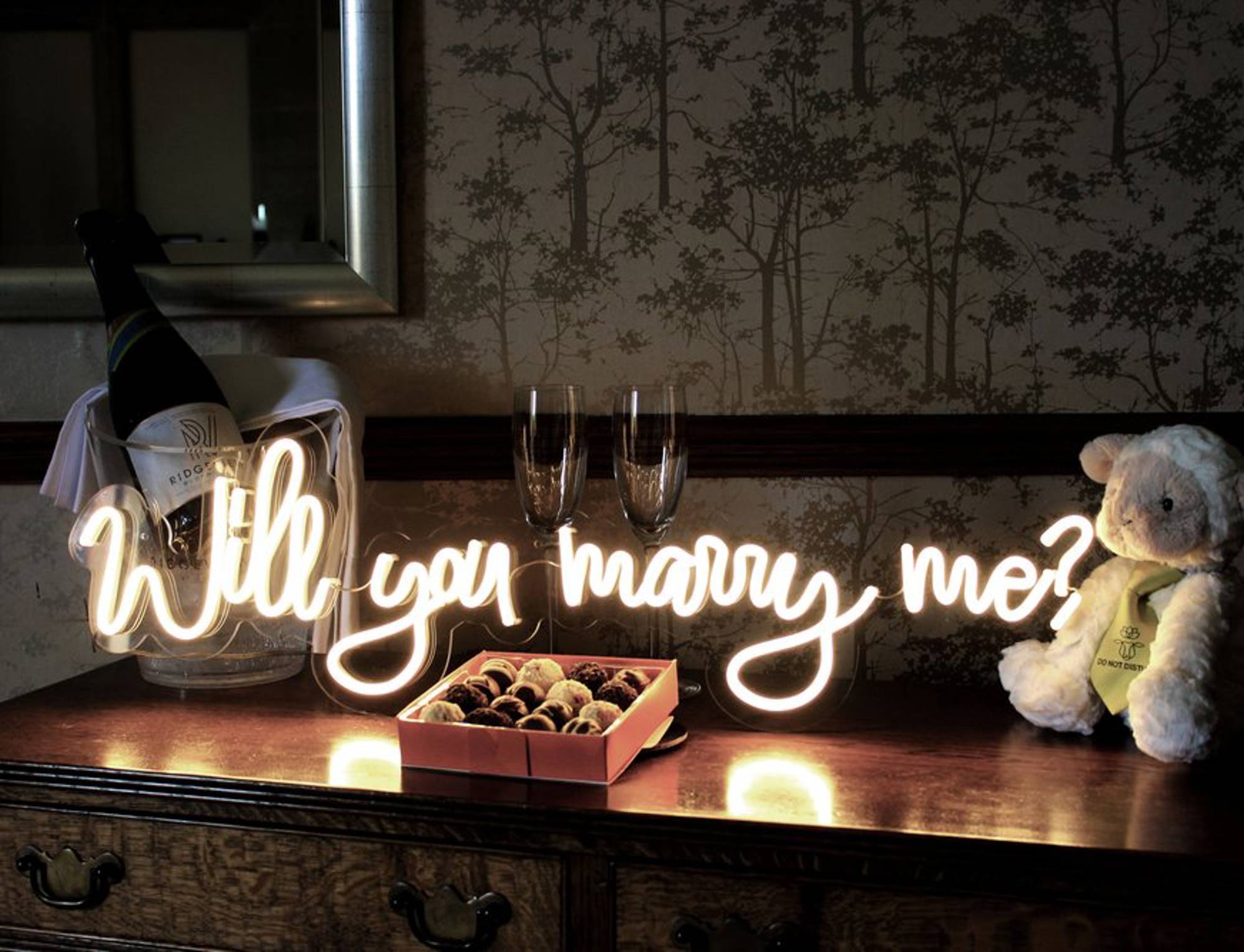 Check in to your room and be greeted by a chilled bottle of Ridgeview English sparkling wine or Wild Idol non-alcoholic wine together with a box of chocolates, a bouquet of seasonal flowers and rose petals scattered on the bed – you're off to a romantic start. Not only that we will have a neon sign waiting with the question ‘Will you marry me?’