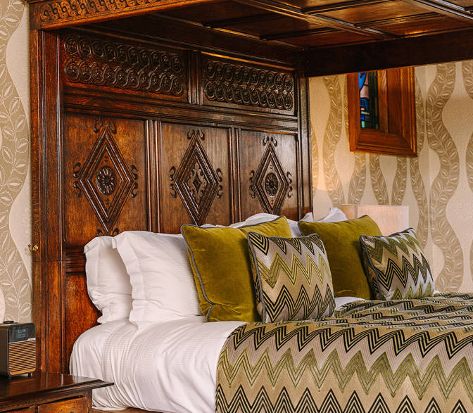 Think pleasingly plush textures, splashes of stained glass – and the focal point: a whopping king-size four-poster bed smack bang in the middle of the room.