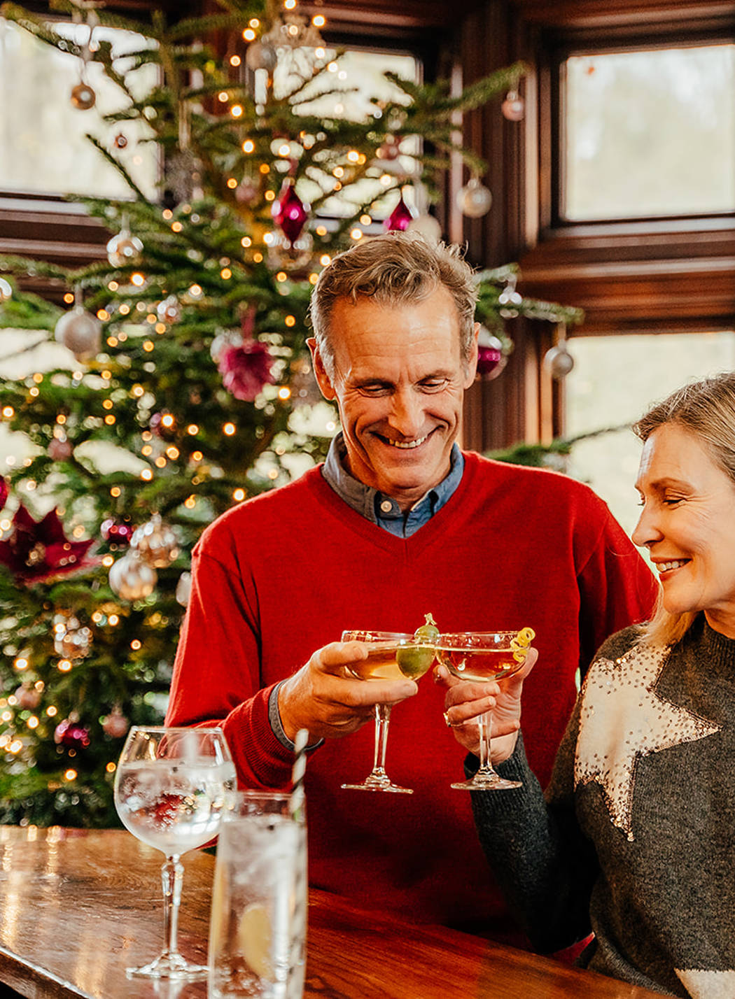 As evening falls, enjoy a gin cocktail and canapés before indulging in a festive dinner, perfectly paired with wines handpicked by our Sommelier and live music once again.