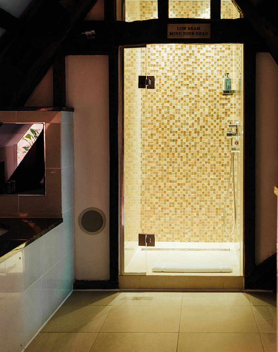 The bathroom offers a walk-in shower, ‘his and hers’ sinks and a deep bath set into marble – with a mounted TV and integrated champagne bucket to boot.
